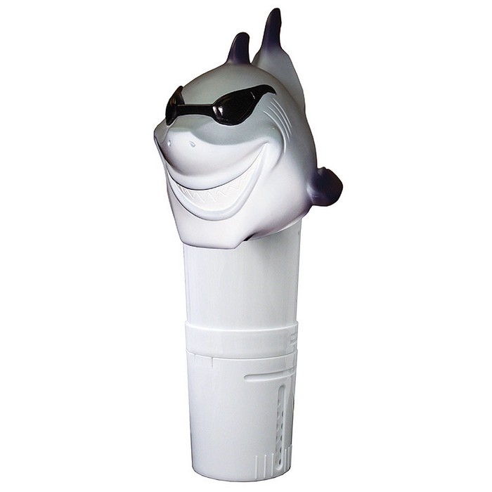 Pływający dozownik zabawkowy Rekin do chlorowania basenów. Seria „Fajne”. Wykonany z nieszkodliwego polimeru. Reguluje intensywność, z jaką środki dezynfekujące dostają się do wody w basenie. Tabletki nie są zawarte w zestawie.