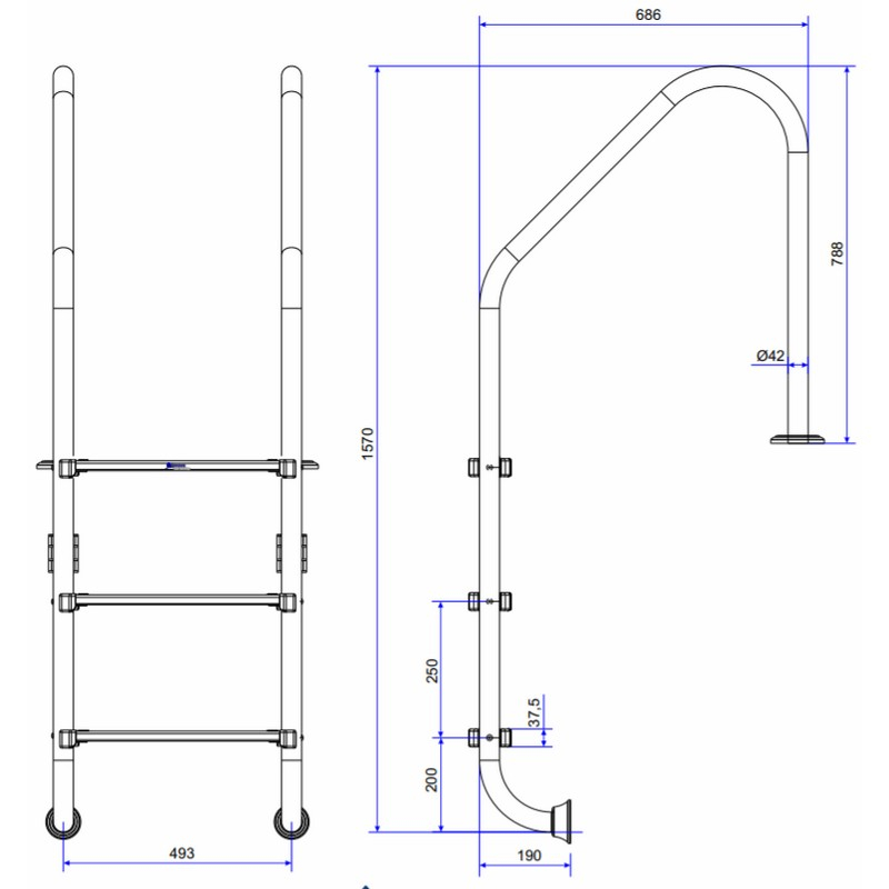 Drabinka Emaux NSL415-SR przeznaczona jest do wygodnego wchodzenia i wychodzenia z basenu. Poręcze i stopnie wykonane są z polerowanej stali nierdzewnej AISI 316. Poręcze są mocowane do brzegu za pomocą kotew z tworzywa sztucznego. Dolna część drabinki opiera się o ścianę basenu gumowymi odbojnikami. Stopnie są mocowane do poręczy za pomocą śrub. Drabinka przeznaczona jest do basenów zagłębionych. Zestaw zawiera elementy mocujące.