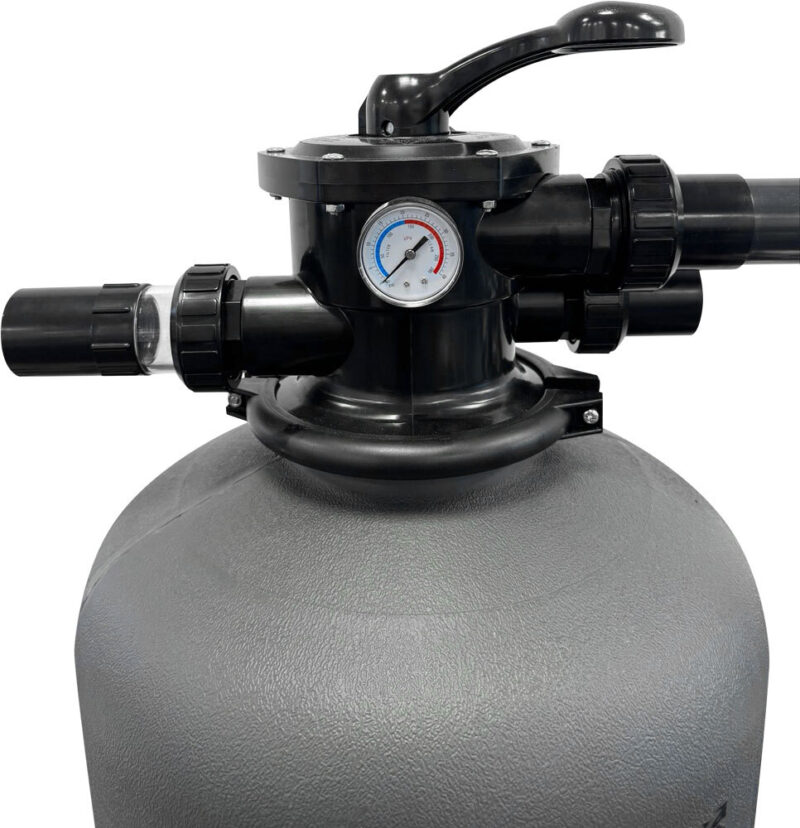 Obudowa filtra wykonana jest z polietylenu o wysokiej wytrzymałości, a obudowa pompy z tworzywa termoplastycznego. Zestaw wyposażony jest w zawór 6-trybowy, manometr i złącza uniwersalne.