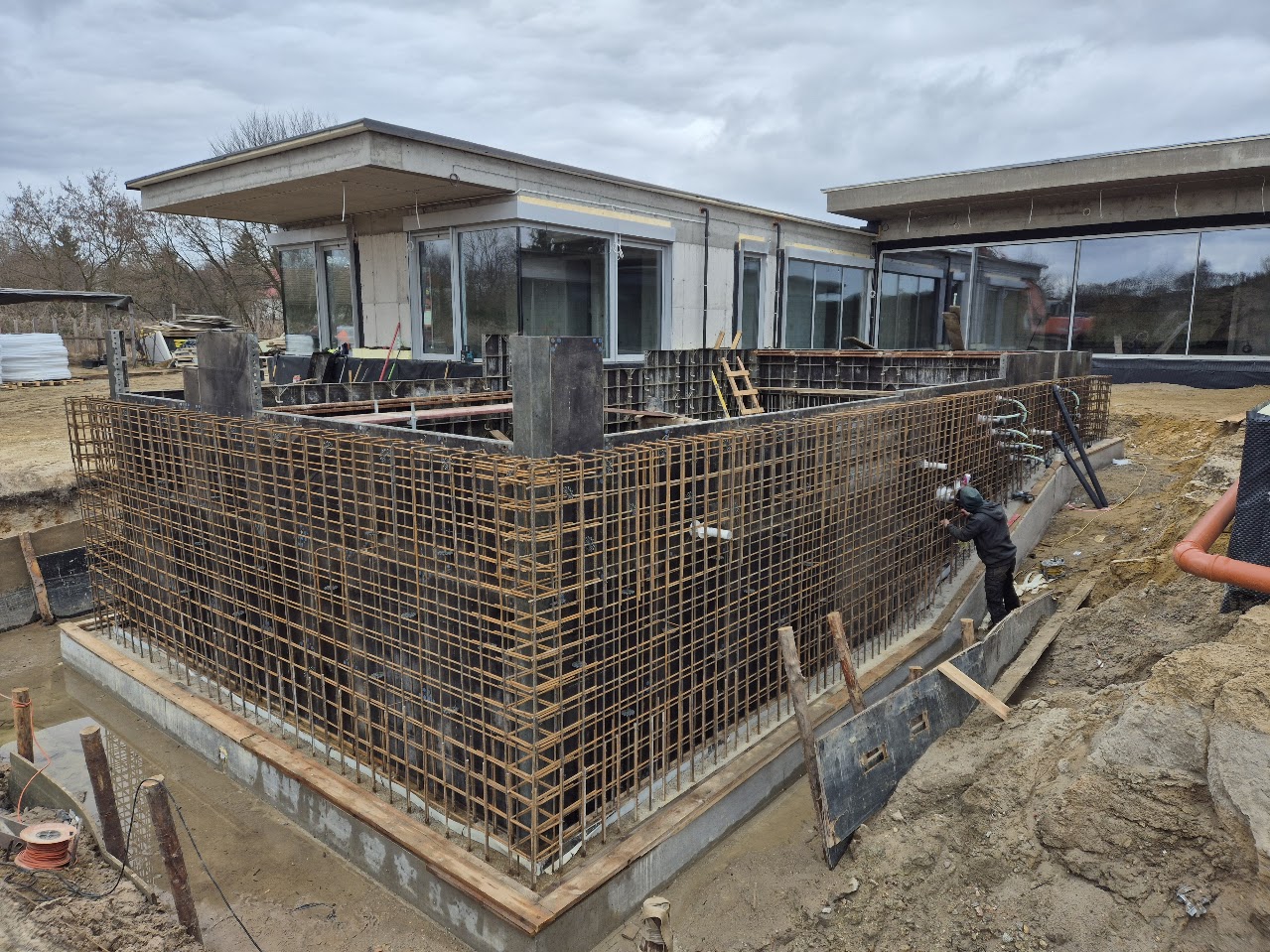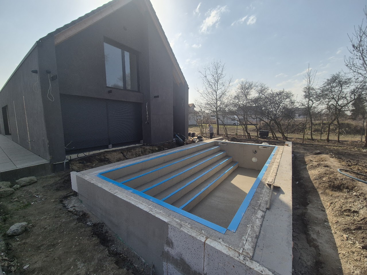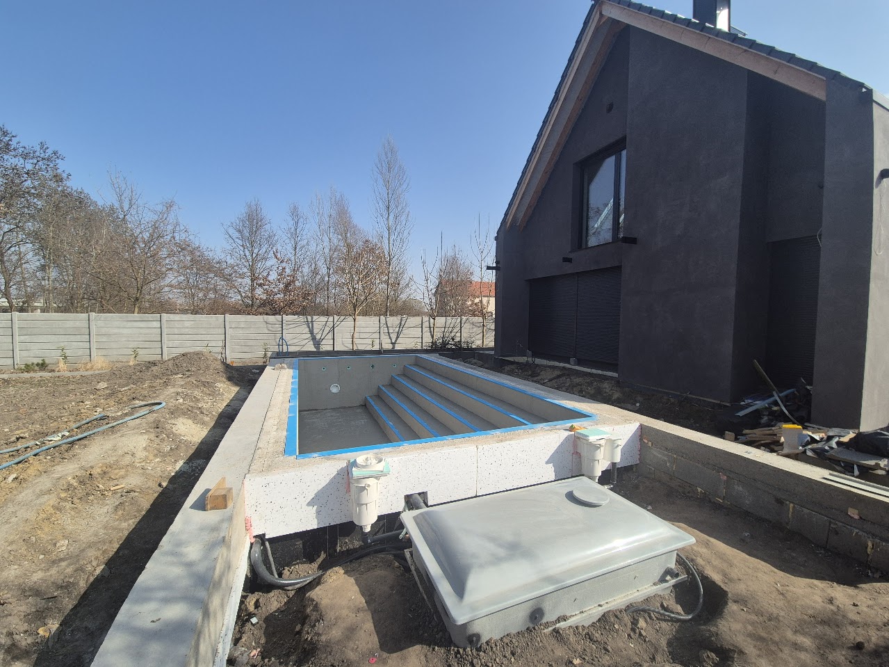Basen zewnetrzny o wymiarze 4x8x1,5m wykonczony folią basenową. Konstrukcja basenu wykonana z bloczkow styropianowych zalanych betonem. Pełna automatyka filtracji, plukania, uzdatniania oraz dopuszczania wody. Ogrzewanie pompą ciepła. Basen przykryty folią bąbelkową oraz na zime przykryciem bezpiecznym.